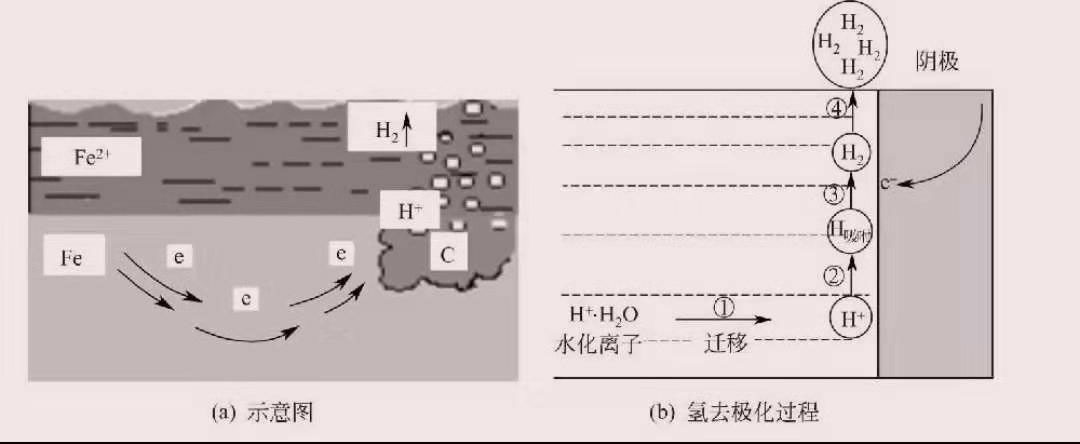 因為鐵與殘渣立即觸碰,相當于輸電線聯接兩方面而變成通道。圖3-3-2 析氫腐蝕 在陽極氧化,鐵喪失電子器件產生Fe2+進到收縮水中,而且與收縮水中的陽離子(如OH-、HCO- 3等)融合成繁雜的鐵鹽,導致金屬鐵生銹,而鐵上不必要的電子器件則遷移到殘渣上;在負極,殘渣(C)自身 不容易喪失電子器件,只起傳送電子器件的功效,而收縮水中的H+就從負極得到電子器件變成H2釋放,正因為溶解氡氣而被稱作析氫腐蝕,其電極反應通式以下。 腐蝕充電電池:(陽極氧化)Fe|H+、OH-|C(殘渣)(負極) 隨后,Fe(OH)2還會被氣體中的氧氣瓶進一步空氣氧化成Fe(OH)3。 4Fe(OH)2+2H2O+O2=4Fe(OH)3 當腐蝕物質干躁時,會造成一部分脫干反映。 2Fe(OH)3=Fe2O3+3H2O Fe(OH)3以及脫干物質Fe2O3是紅褐色銹跡的關鍵成份。 ②吸氧腐蝕 事實上,析氫腐蝕僅僅在酸堿性物質自然環境中產生的(如霧霾高發地域等)。而在更普遍的大氣污染中,鋼架結構腐蝕關鍵是吸氧腐蝕(圖3-3-3)。