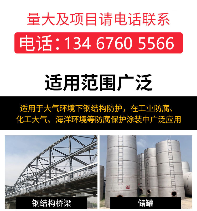環(huán)氧云鐵中間漆適用于防腐性能要求較高的鋼鐵工件的防腐底漆或中間漆。如船舶、集裝箱、橋梁、水工閥門及構(gòu)件、煤氣柜、化工容器內(nèi)外壁、氟碳涂料,裝飾性聚氨酯面漆涂層用以增加厚度和豐滿度的中間涂層,環(huán)氧富鋅底漆的附加涂層等。